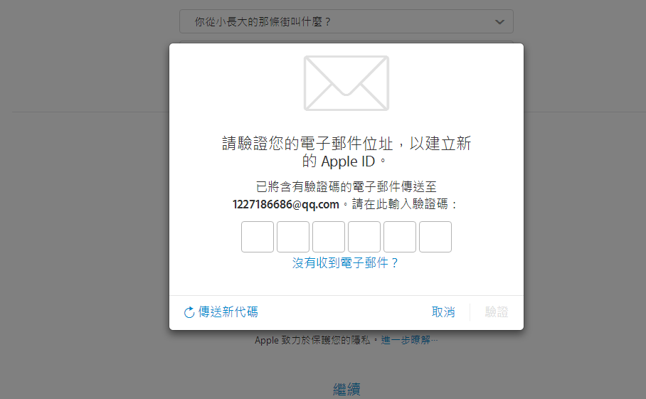 (2)信息填写完毕之后,点击【继续】按钮,将发送验证码至你的邮箱,点击邮箱查看并输入验证码。