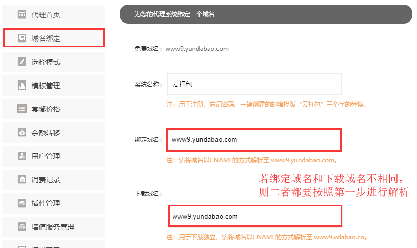 第一步:请将需要绑定的域名以CNAME的方式解析至 www9.yundabao.com